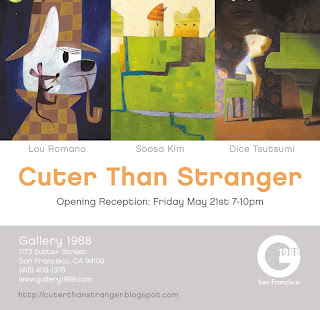 Lou Romano, Dice Tsutsumi, and Soosa Kim are having an art show this Friday at Gallery 1988 in San Francisco. For some of of you who may not know, Lou was the production Designer on Incredibles, and has done numerous other inspirational work for Pixar films, as well as several other projects. Dice just finished off working on Toy Story 3 and has done the most beautiful lighting study paintings for this film. Once you see TS3, and you see how beautifully lit the film is, you'll know that it's Dice's touch. Soosa Kim is also another talented artist that I am not that familiar with, but I hear that he is a very interesting person. But anyways, here's the flyer for the upcoming show. The opening is this Friday.